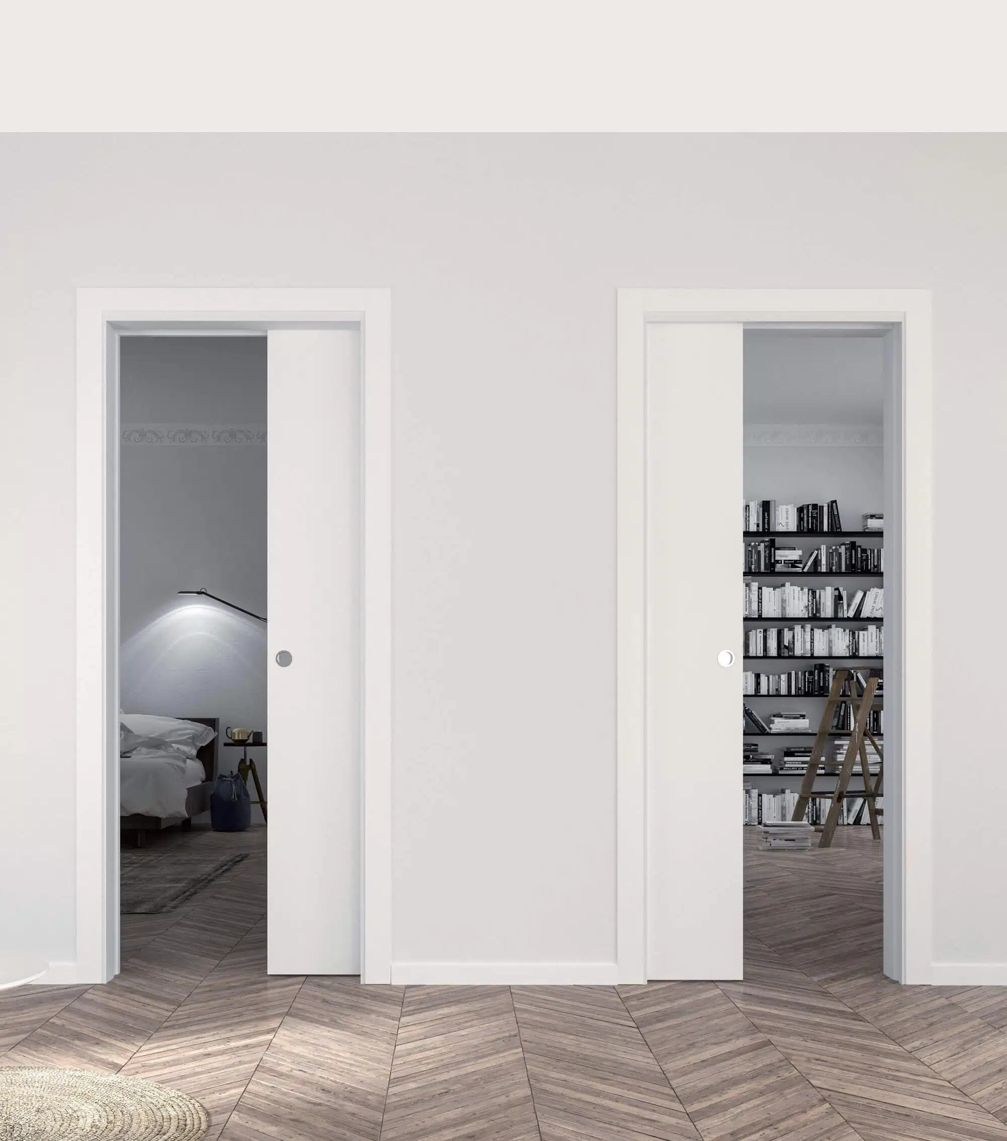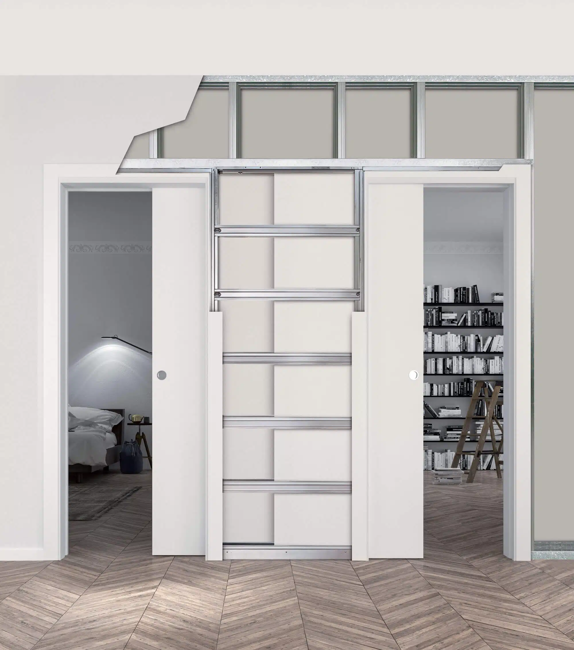 ECLISSE Zákryt je promyšlené stavební pouzdro určené pro dvoje posuvné dveře proti sobě, které se elegantně zasouvají do jedné společné stěny uprostřed. Tento systém ocení každý, kdo chce efektivně využít prostor mezi dvěma místnostmi, aniž by musel instalovat dvě oddělená pouzdra.