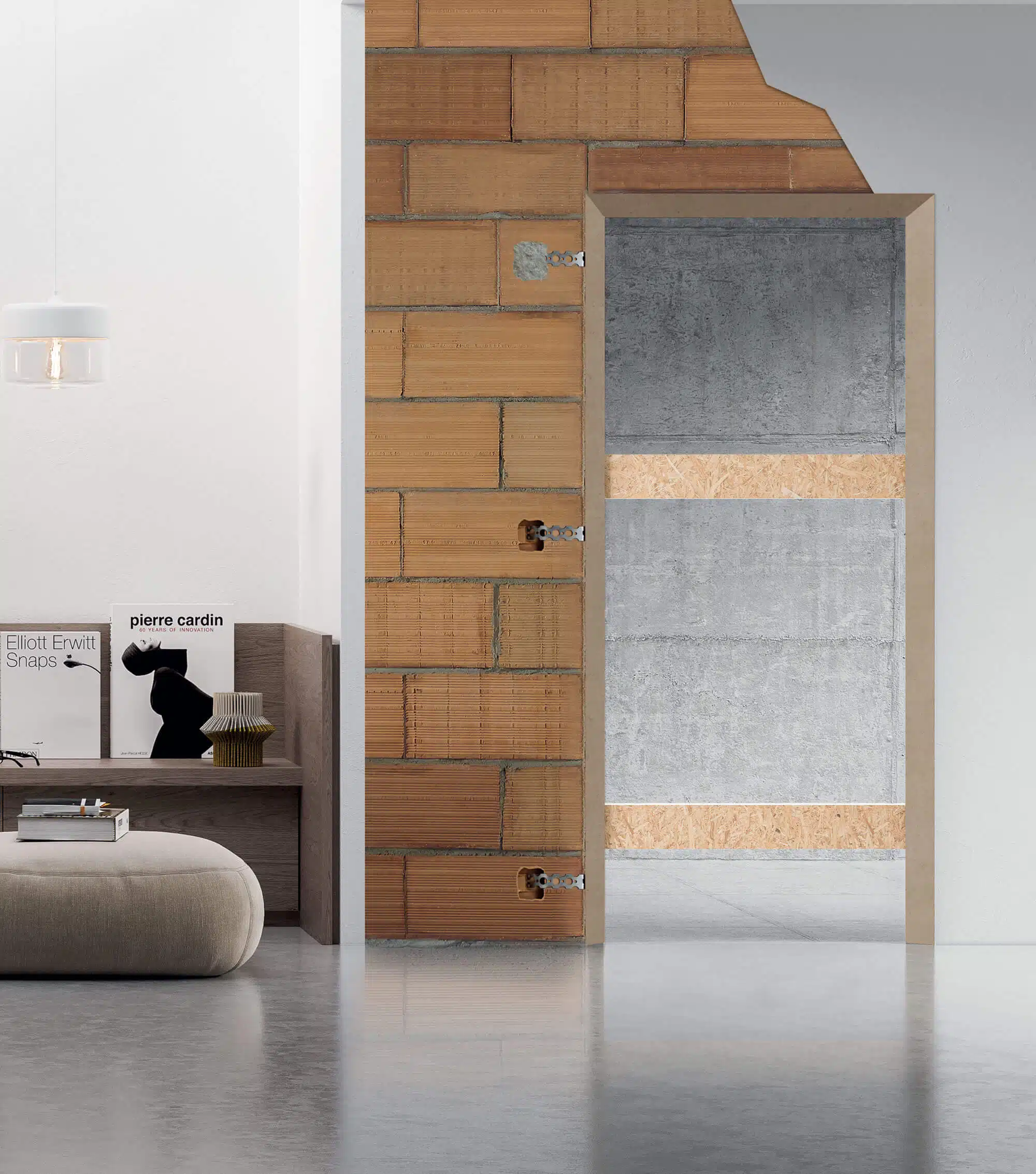 Jediná zárubeň rám na trhu, která esteticky řeší obě strany stěny: na jedné straně je zárubeň sešikmená do úhlu 40 ° a vytváří tak jedinečnou hloubku, na druhé straně jsou dveře minimalisticky sjednocené do jedné roviny se stěnou.